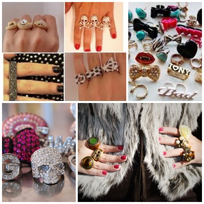 ANEIS: O anel passou a ser um acessório básico da moda, e a tendência são os anéis grandes que estão em alta para essa estação . Atualmente, os anéis são tendências e transmite um estilo próprio e vale apostar em flores, pedrarias, animais,bigodes,carinhas, brilhos, nos tons prata ou dourado. Para as pessoas que gosta de usar somente um anel a regra é exagerar.